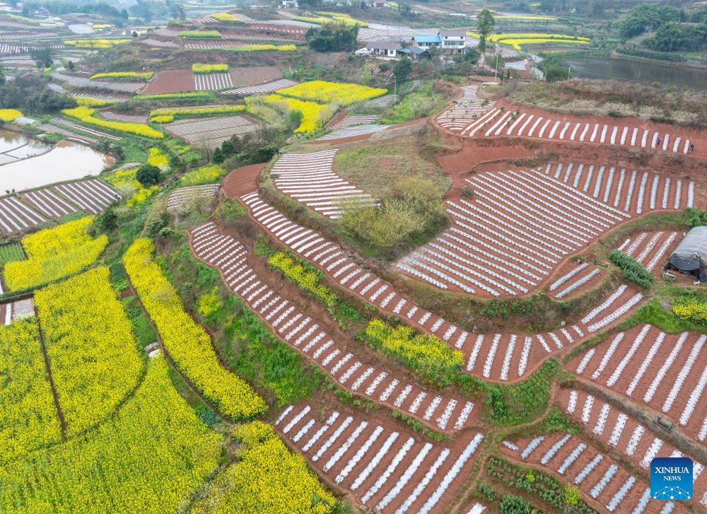 An aerial drone photo taken on March 6, 2026 shows a view of farmlands in Tiangongmiao Village, Lede Town, Rongxian County of southwest China's Sichuan Province. (Xinhua/Jiang Hongjing)