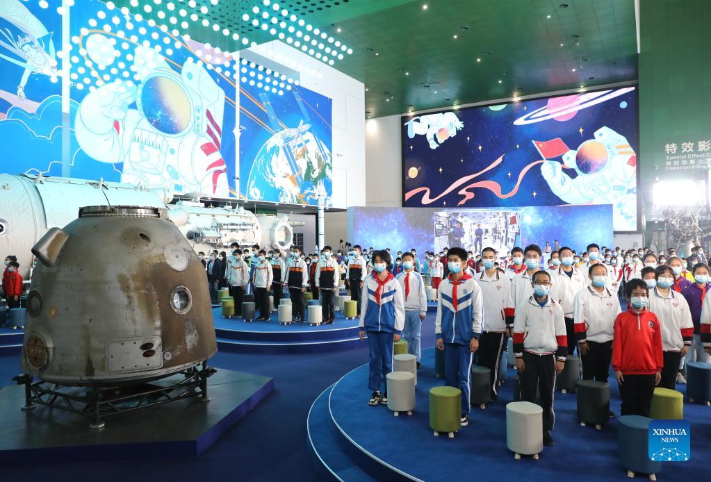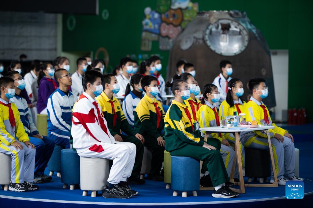 Students attend a live class given by the Shenzhou-13 crew members, at the China Science and Technology Museum in Beijing, capital of China, Dec. 9, 2021. The first live class from China's space station was held on Thursday afternoon, given by Shenzhou-13 crew members Zhai Zhigang, Wang Yaping and Ye Guangfu to students on Earth. (Xinhua/Jin Liwang)