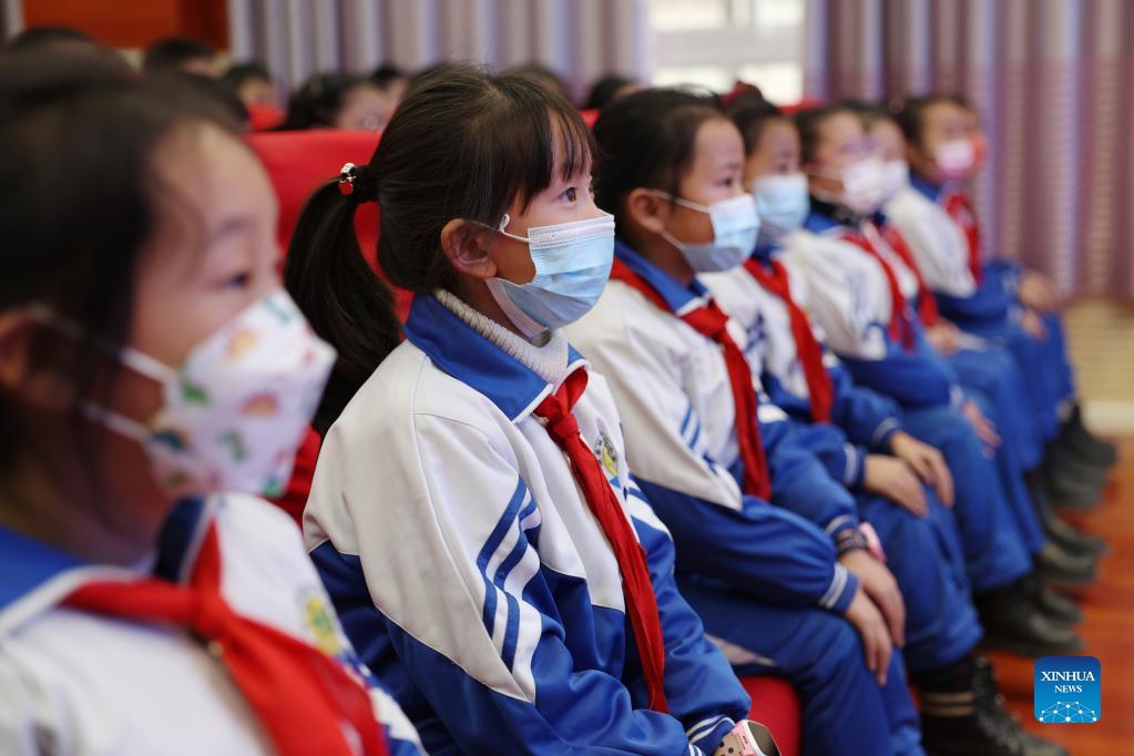 Students attend a live class given by the Shenzhou-13 crew members, in Kangxian County, northwest China's Gansu Province, Dec. 9, 2021. The first live class from China's space station was held on Thursday afternoon, given by Shenzhou-13 crew members Zhai Zhigang, Wang Yaping and Ye Guangfu to students on Earth. (Xinhua/Chen Bin)