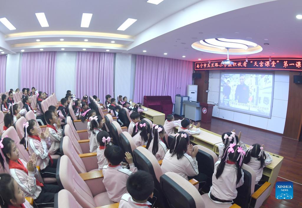 Students attend a live class given by the Shenzhou-13 crew members, in Nanning, capital of south China's Guangxi Zhuang Autonomous Region, Dec. 9, 2021. The first live class from China's space station was held on Thursday afternoon, given by Shenzhou-13 crew members Zhai Zhigang, Wang Yaping and Ye Guangfu to students on Earth. (Xinhua/Zhou Hua)