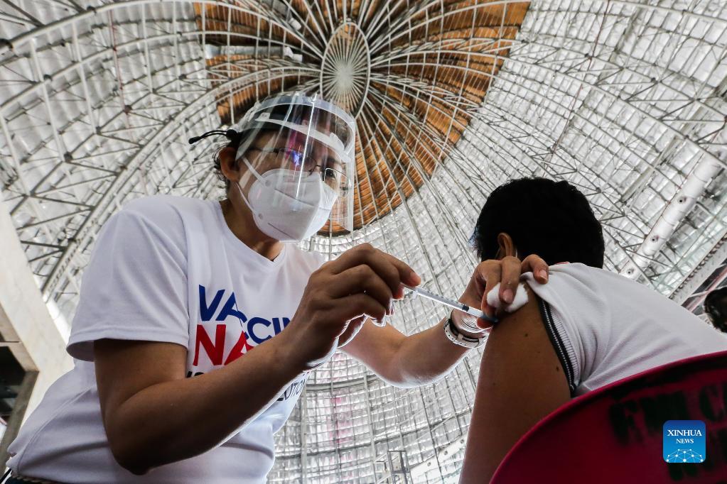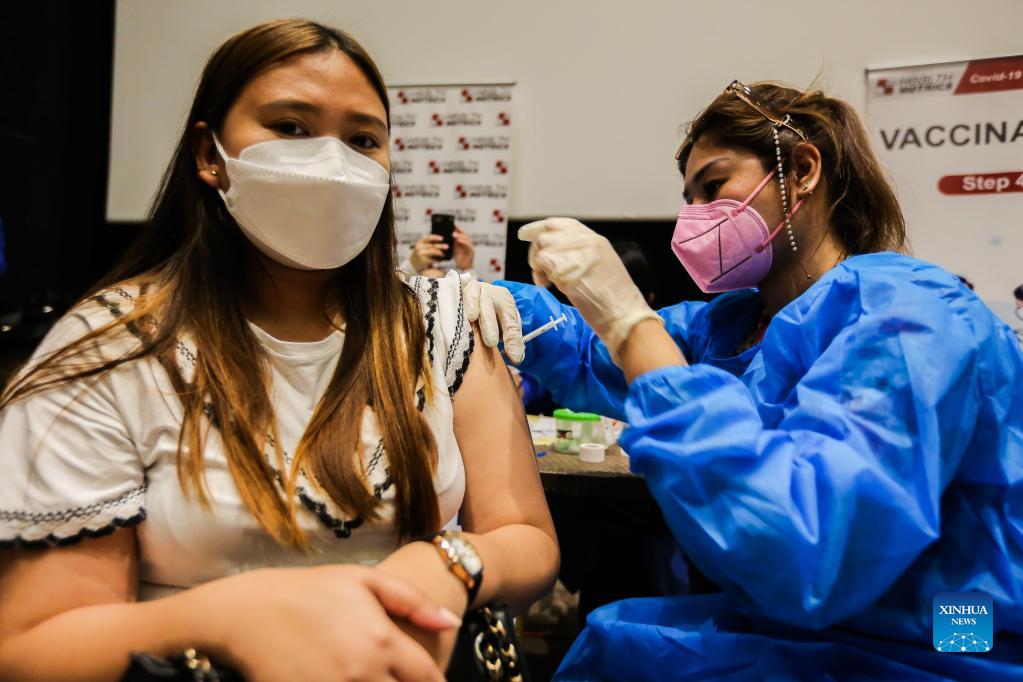 A woman is inoculated with a COVID-19 vaccine at a vaccination area inside a mall in Pasay City, the Philippines, Dec. 16, 2021. The Philippines has recorded its first two confirmed cases of the Omicron variant in two travelers from Nigeria and Japan respectively, the Department of Health (DOH) said on Wednesday. (Xinhua/Rouelle Umali)