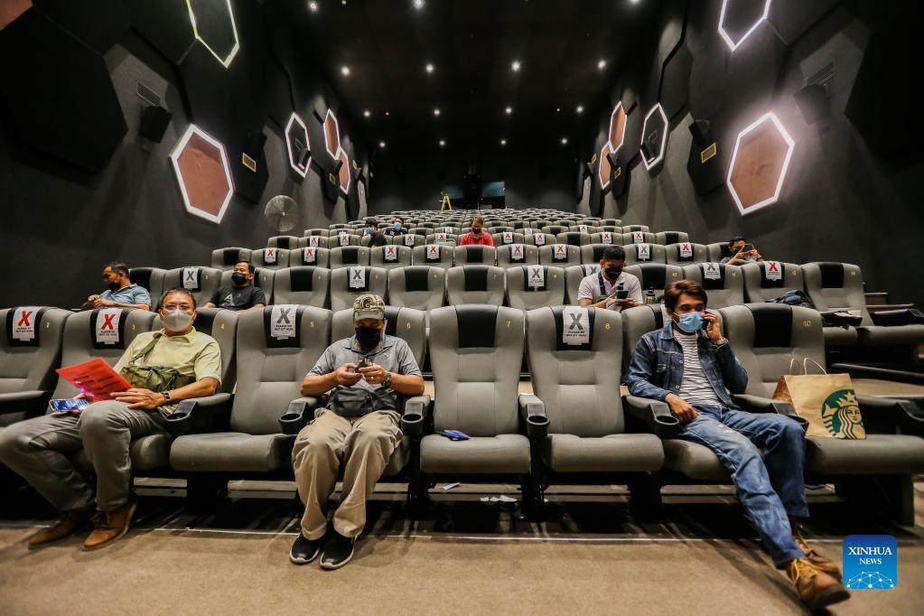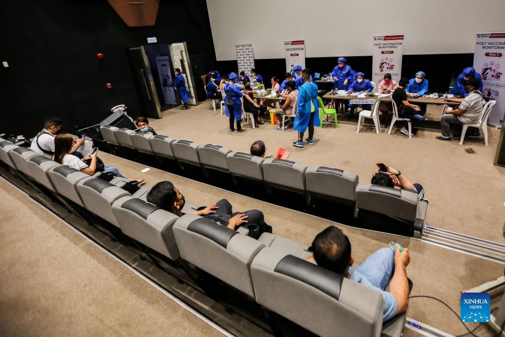 People wait to get inoculated with COVID-19 vaccine at a cinema which was turned into a vaccination area inside a mall in Pasay City, the Philippines, Dec. 16, 2021. The Philippines has recorded its first two confirmed cases of the Omicron variant in two travelers from Nigeria and Japan respectively, the Department of Health (DOH) said on Wednesday. (Xinhua/Rouelle Umali)