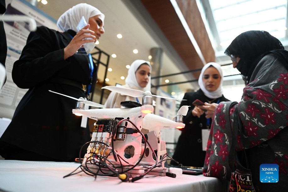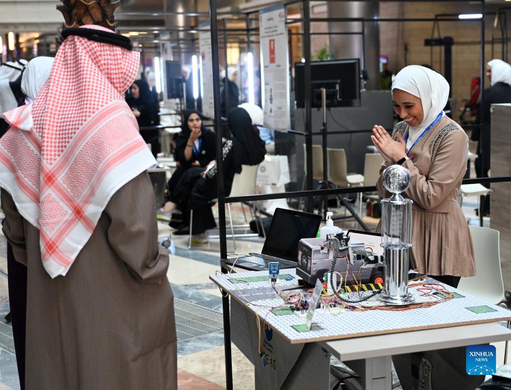 Students display a project during an engineering exhibition in Farwaniya Governorate, Kuwait, Dec. 18, 2021. Kuwait University opened on Saturday an engineering exhibition of graduation projects in Farwaniya Governorate. The exhibition will last until Dec. 19. (Photo by Asad/Xinhua)