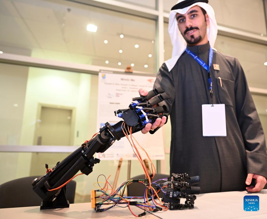 A student displays a project during an engineering exhibition in Farwaniya Governorate, Kuwait, Dec. 18, 2021. Kuwait University opened on Saturday an engineering exhibition of graduation projects in Farwaniya Governorate. The exhibition will last until Dec. 19. (Photo by Asad/Xinhua)