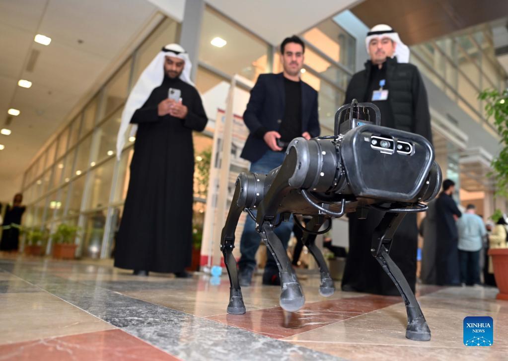 Students display a robot dog during an engineering exhibition in Farwaniya Governorate, Kuwait, Dec. 18, 2021. Kuwait University opened on Saturday an engineering exhibition of graduation projects in Farwaniya Governorate. The exhibition will last until Dec. 19. (Photo by Asad/Xinhua)