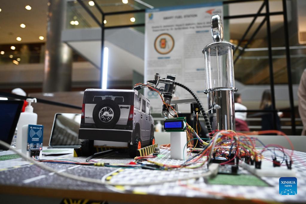 Photo taken on Dec. 18, 2021 shows a project about a smart fuel station during an engineering exhibition in Farwaniya Governorate, Kuwait. Kuwait University opened on Saturday an engineering exhibition of graduation projects in Farwaniya Governorate. The exhibition will last until Dec. 19. (Photo by Asad/Xinhua)