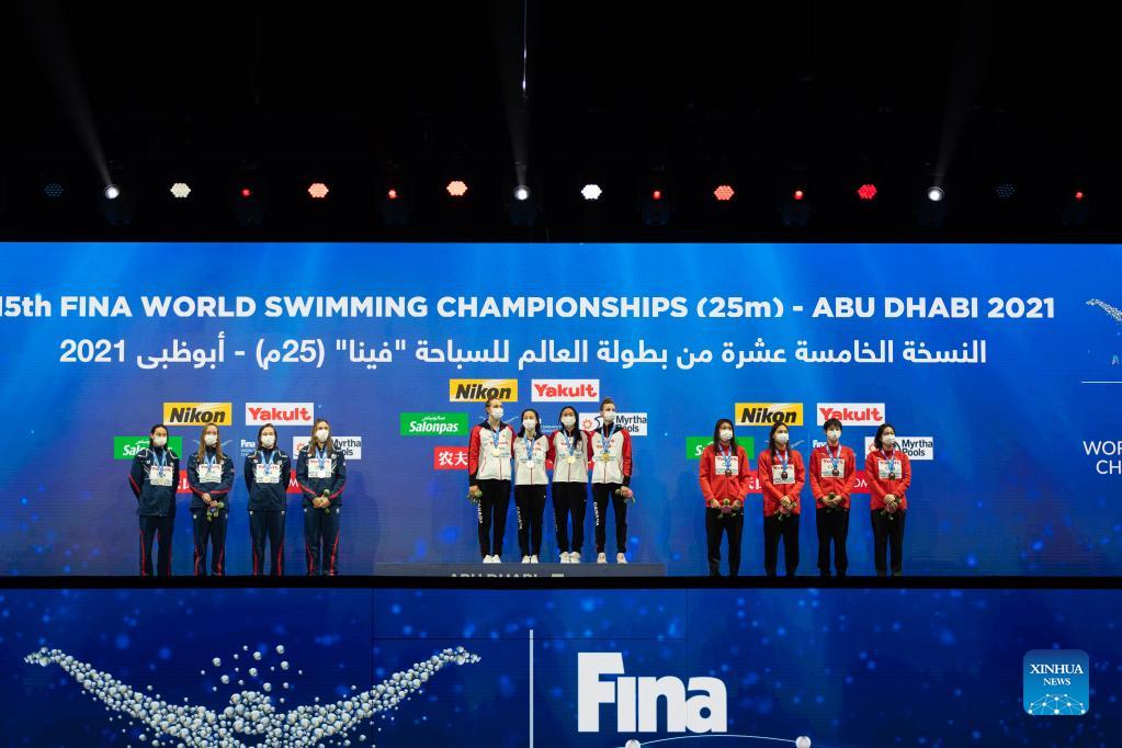 Gold medalists Team Canada (C), silver medalists Team USA (L) and bronze medalists Team China pose on the podium during the awarding ceremony of the Women's 200m Freestyle Relay Final at 15th FINA World Swimming Championships (25m) in Abu dhabi, the United Arab Emirates (UAE), on Dec. 20, 2021. (Xinhua)