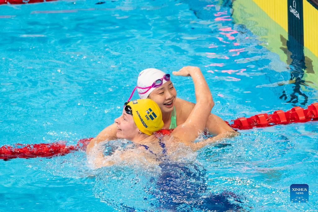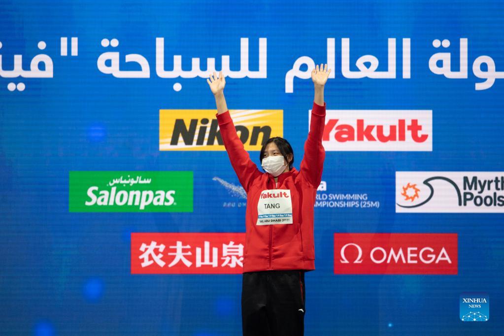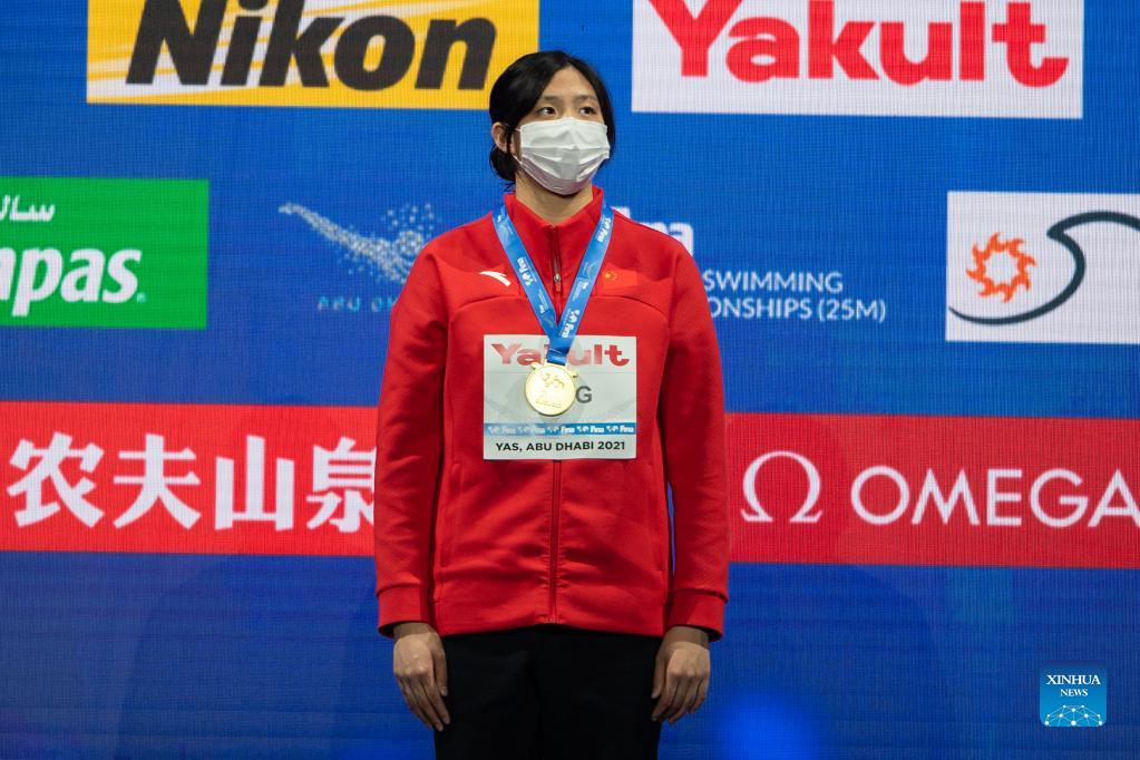 Tang Qianting of China attends the awarding ceremony of the Women's 100m Breaststroke Final at 15th FINA World Swimming Championships (25m) in Abu dhabi, the United Arab Emirates (UAE), on Dec. 20, 2021. (Xinhua)