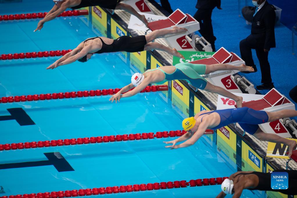 Tang Qianting (C) of China competes the Women's 100m Breaststroke Final at 15th FINA World Swimming Championships (25m) in Abu dhabi, the United Arab Emirates (UAE), on Dec. 20, 2021. (Xinhua)