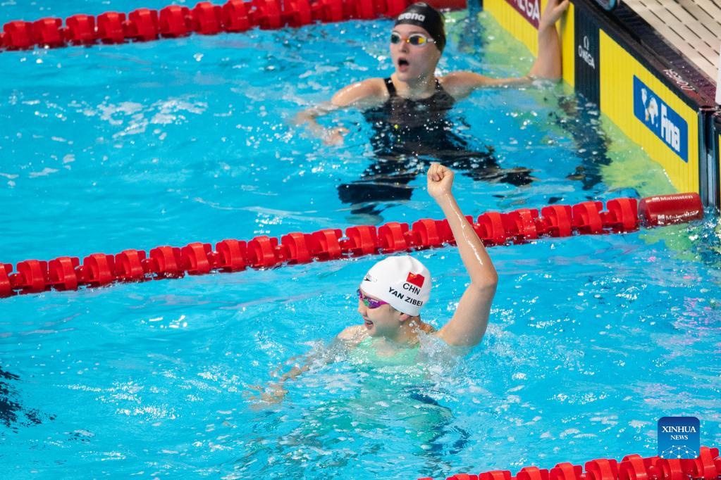 Tang Qianting (Top) of China celebrates after winning the Women's 100m Breaststroke Final at 15th FINA World Swimming Championships (25m) in Abu dhabi, the United Arab Emirates (UAE), on Dec. 20, 2021. (Xinhua)