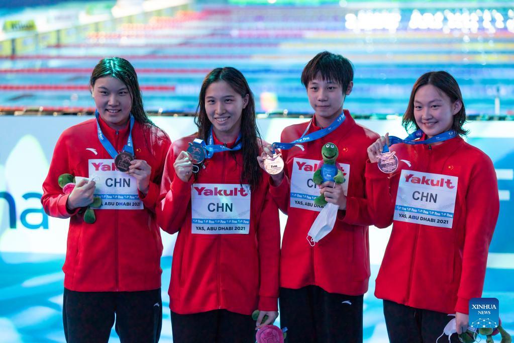 Team China celebrates after the awarding ceremony of the Women's 200m Freestyle Relay Final at 15th FINA World Swimming Championships (25m) in Abu dhabi, the United Arab Emirates (UAE), on Dec. 20, 2021. (Xinhua)