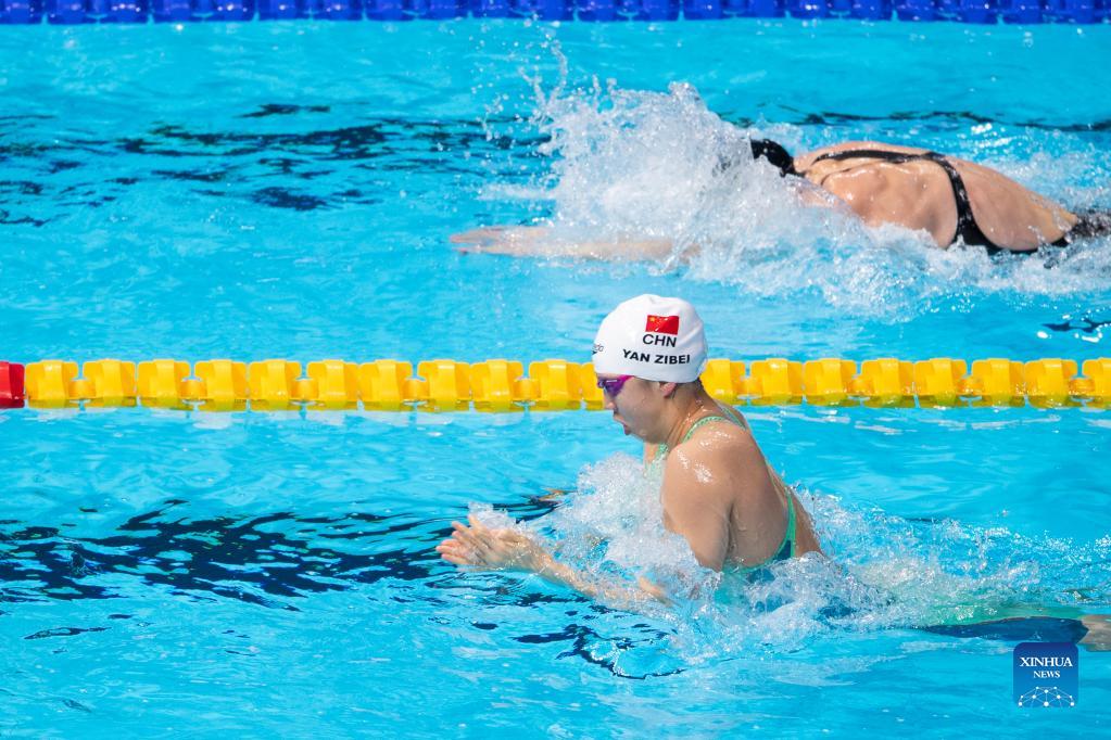 Tang Qianting (Bottom) of China competes during the Women's 100m Breaststroke Final at 15th FINA World Swimming Championships (25m) in Abu dhabi, the United Arab Emirates (UAE), on Dec. 20, 2021. (Xinhua)