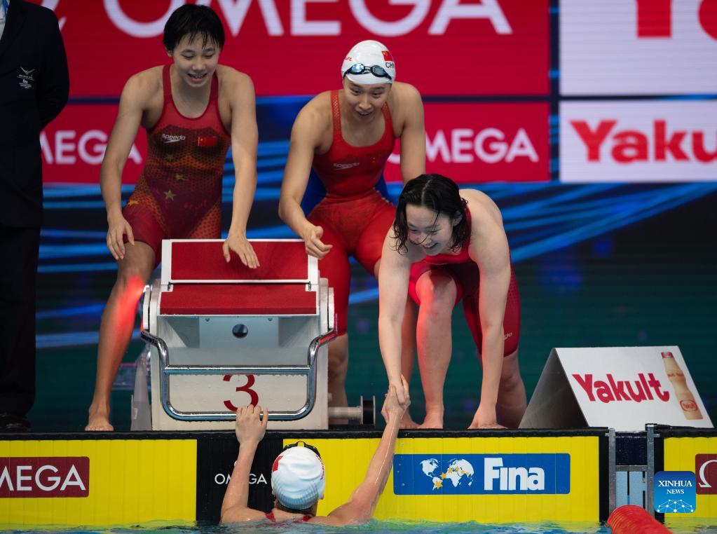 Team China celebrates after winning the Women's 200m Freestyle Relay Final at 15th FINA World Swimming Championships (25m) in Abu dhabi, the United Arab Emirates (UAE), on Dec. 20, 2021. (Xinhua)