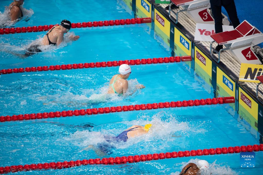 Tang Qianting (C) of China competes during the Women's 100m Breaststroke Final at 15th FINA World Swimming Championships (25m) in Abu dhabi, the United Arab Emirates (UAE), on Dec. 20, 2021. (Xinhua)