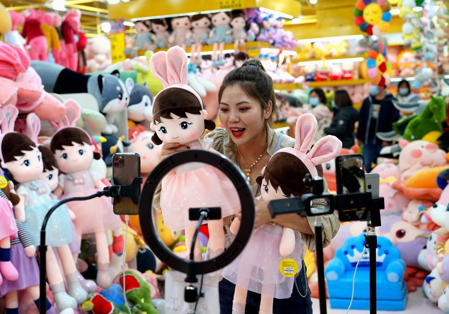 A saleswoman promotes stuffed toys via livestreaming at an international trading center in Baigou New Township, Baoding City of north China's Hebei Province, Feb. 2, 2021. (Photo by Feng Yun/Xinhua)