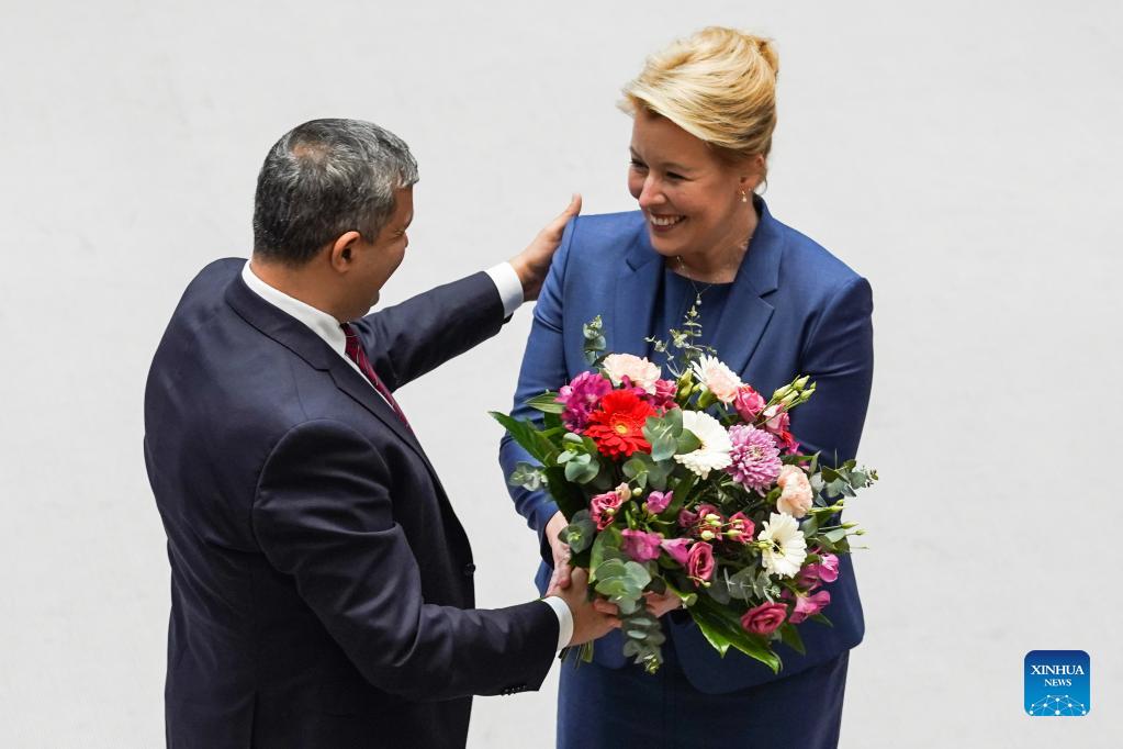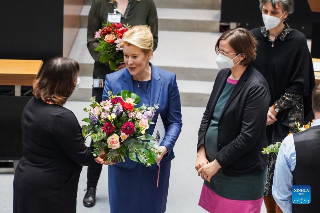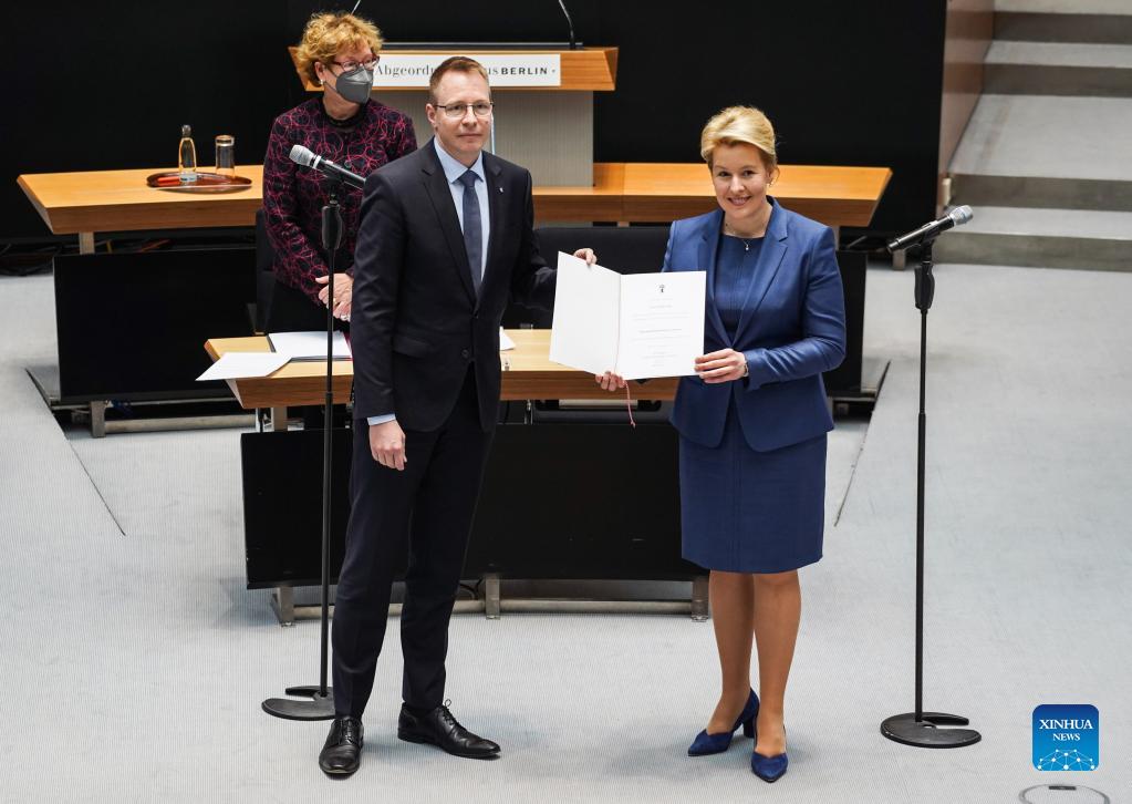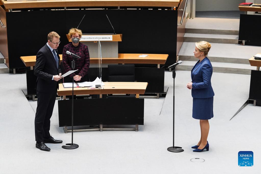 Franziska Giffey (R) is sworn in as the new mayor of Berlin in Berlin, Germany, Dec. 21, 2021. Former German Minister for Family Affairs Franziska Giffey from the Social Democratic Party (SPD) was elected as the new mayor of Berlin on Tuesday, becoming the first elected female mayor of the city. (Photo by Stefan Zeitz/Xinhua)