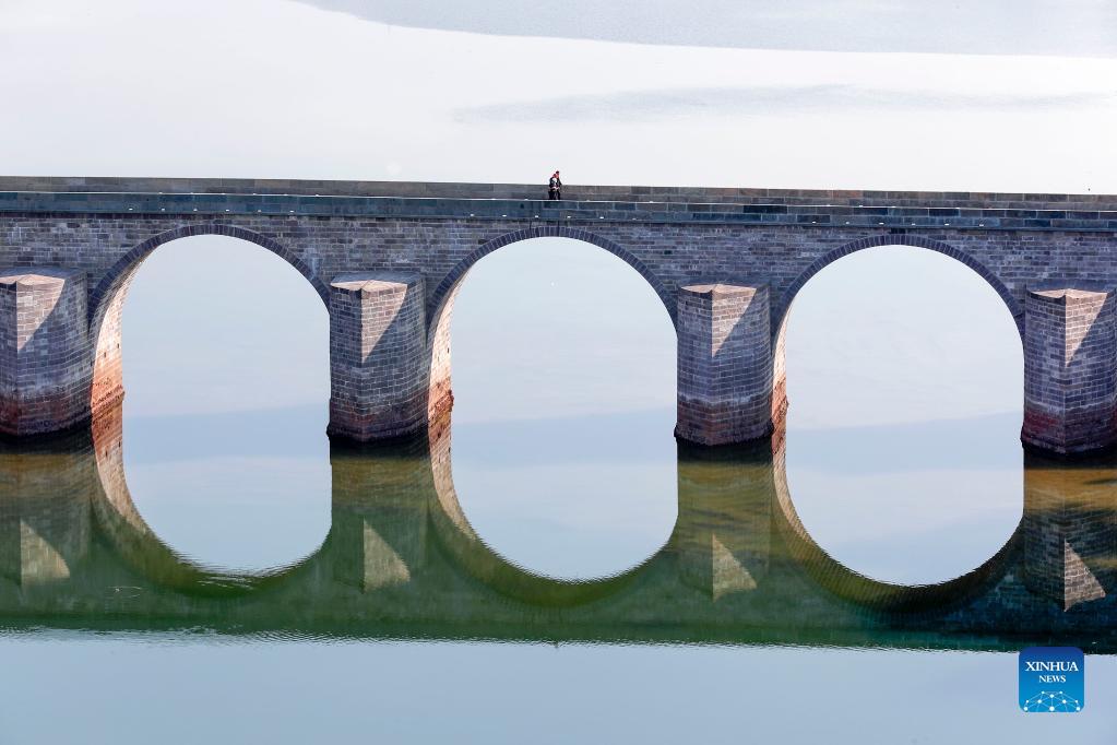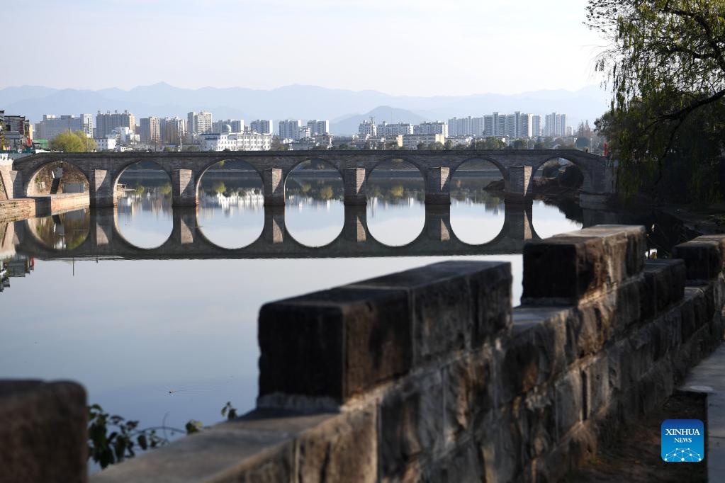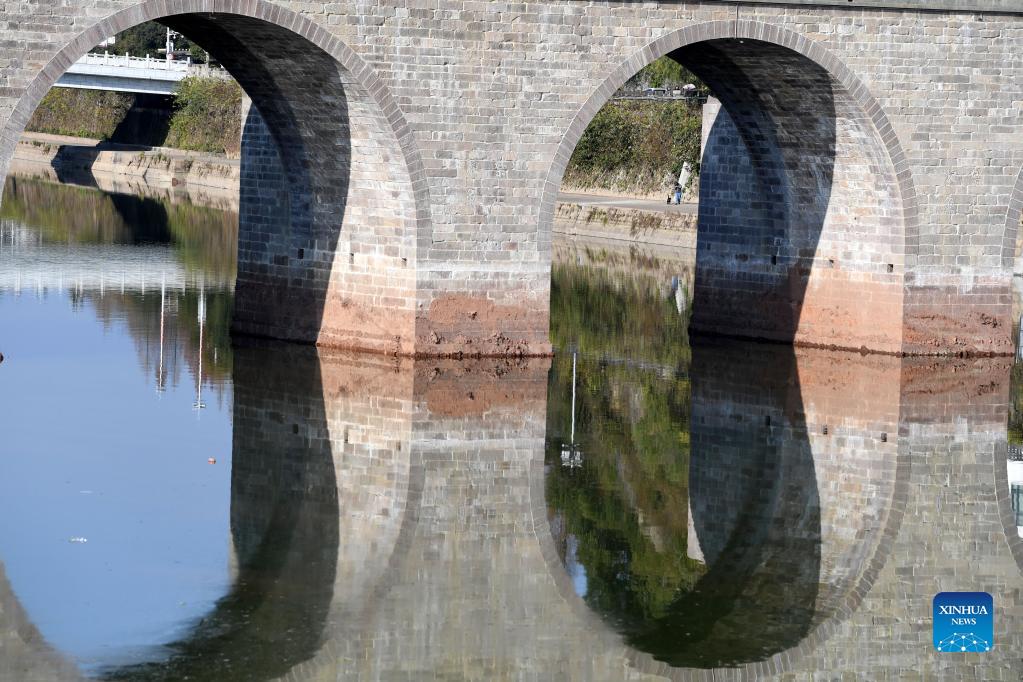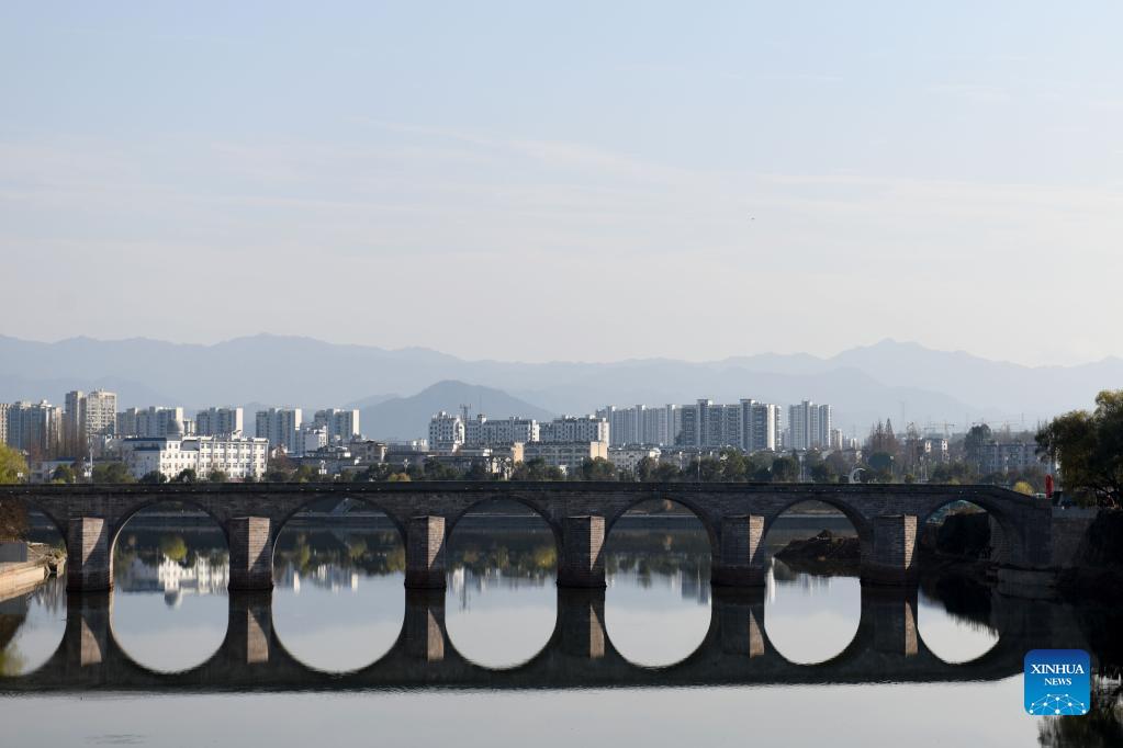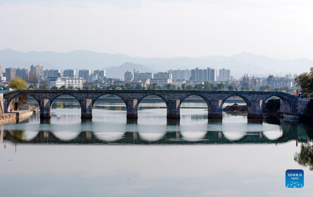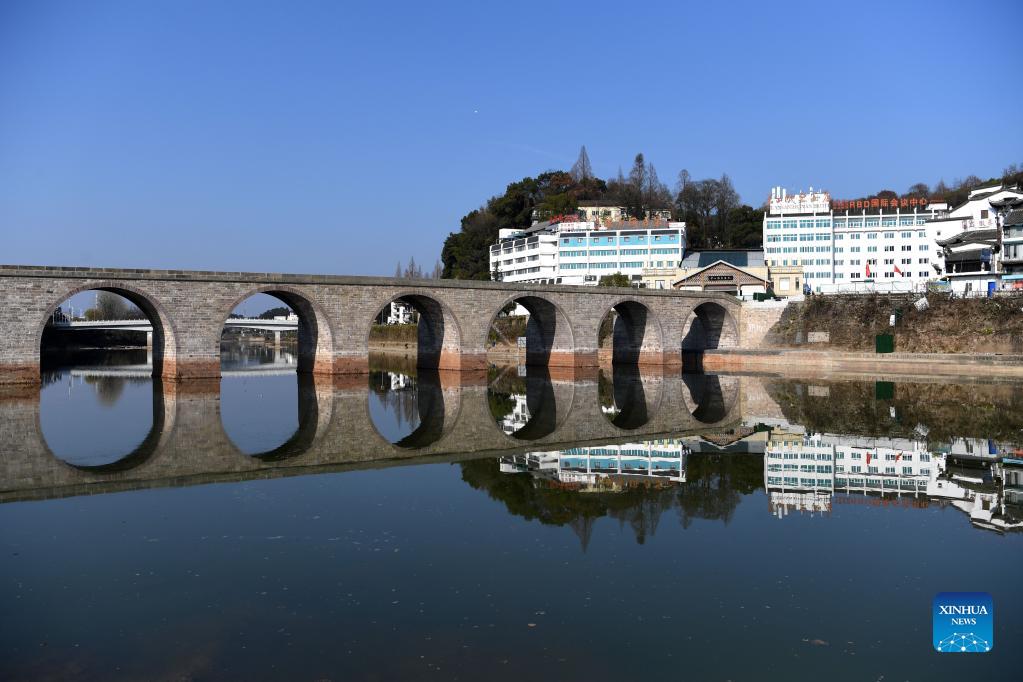 Photo shows the repaired Zhenhai Bridge in Tunxi District of Huangshan, east China's Anhui Province, Dec. 21, 2021. An ancient bridge destroyed by floods in east China's Anhui Province will reopen soon after repair, local authorities said. The repair work, which started on Nov. 13, 2020, has been completed and passed quality inspection on Tuesday. The Zhenhai Bridge, built during the Ming Dynasty (1368-1644), was a state-level cultural relics protection site in the city of Huangshan. Floodwaters destroyed the 131-meter-long bridge during a heavy rainstorm on July 7, 2020. (Xinhua/Liu Junxi)