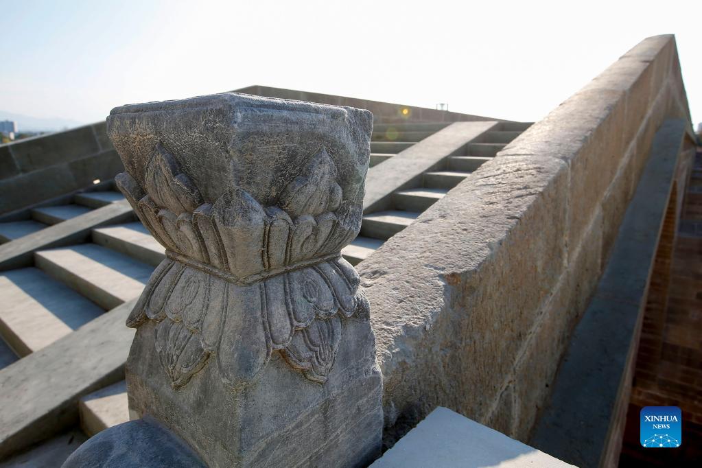 Photo shows the repaired Zhenhai Bridge in Tunxi District of Huangshan, east China's Anhui Province, Dec. 21, 2021. An ancient bridge destroyed by floods in east China's Anhui Province will reopen soon after repair, local authorities said. The repair work, which started on Nov. 13, 2020, has been completed and passed quality inspection on Tuesday. The Zhenhai Bridge, built during the Ming Dynasty (1368-1644), was a state-level cultural relics protection site in the city of Huangshan. Floodwaters destroyed the 131-meter-long bridge during a heavy rainstorm on July 7, 2020. (Xinhua/Huang Bohan)