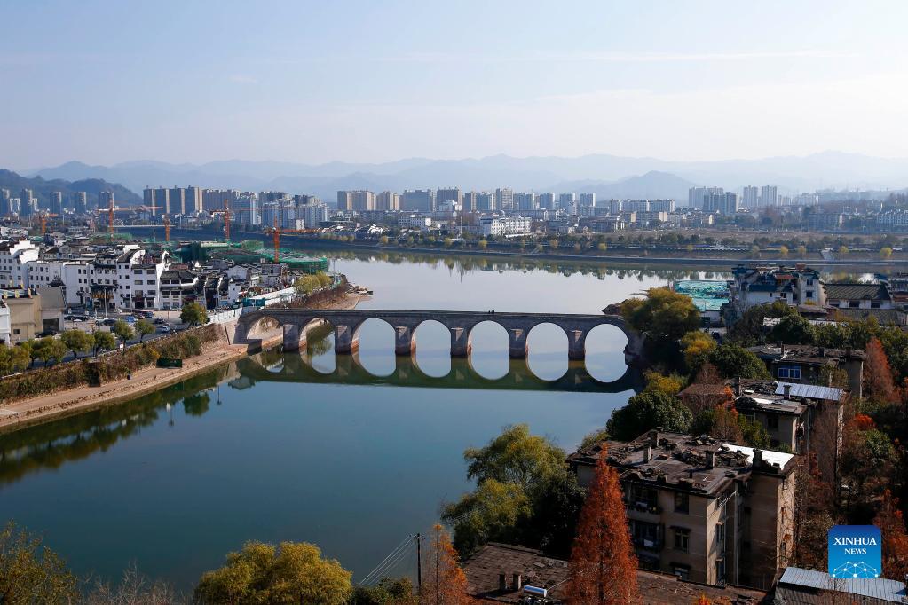 Photo shows the repaired Zhenhai Bridge in Tunxi District of Huangshan, east China's Anhui Province, Dec. 21, 2021. An ancient bridge destroyed by floods in east China's Anhui Province will reopen soon after repair, local authorities said. The repair work, which started on Nov. 13, 2020, has been completed and passed quality inspection on Tuesday. The Zhenhai Bridge, built during the Ming Dynasty (1368-1644), was a state-level cultural relics protection site in the city of Huangshan. Floodwaters destroyed the 131-meter-long bridge during a heavy rainstorm on July 7, 2020. (Xinhua/Chen Shangying)