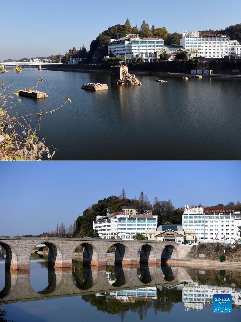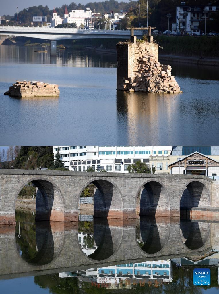 Combo photo shows the flood-destroyed Zhenhai Bridge on Nov. 12, 2020 (upper, Xinhua/Zhou Mu) and the repaired Zhenhai Bridge in Tunxi District of Huangshan, east China's Anhui Province, Dec. 21, 2021 (Xinhua/Liu Junxi). An ancient bridge destroyed by floods in east China's Anhui Province will reopen soon after repair, local authorities said. The repair work, which started on Nov. 13, 2020, has been completed and passed quality inspection on Tuesday. The Zhenhai Bridge, built during the Ming Dynasty (1368-1644), was a state-level cultural relics protection site in the city of Huangshan. Floodwaters destroyed the 131-meter-long bridge during a heavy rainstorm on July 7, 2020. (Xinhua)