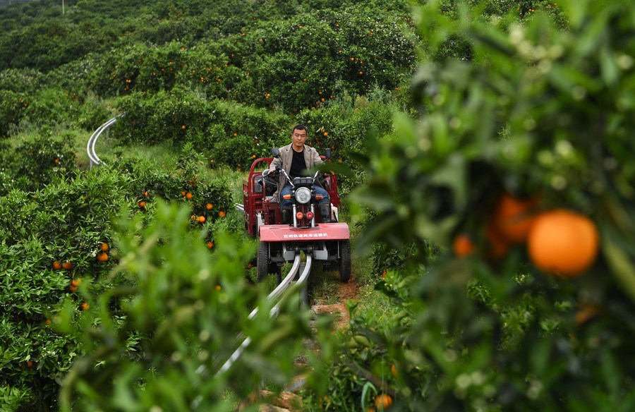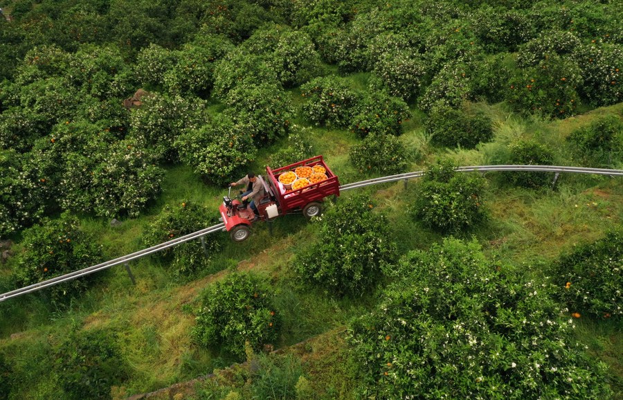 A villager drives a four-wheeled truck with harvested oranges on a track zigzagging along the terrain of the hillside in an orchard in Santuo Village of Fengjie County, southwest China's Chongqing, March 31, 2021. (Xinhua/Wang Quanchao)