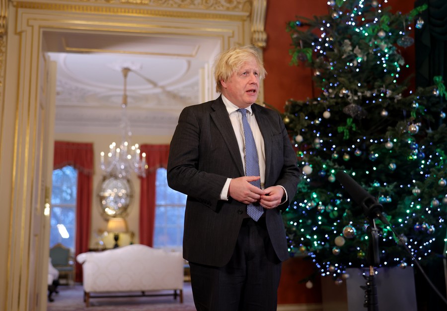 British Prime Minister Boris Johnson records a video in London, Britain, Dec. 21, 2021. (Andrew Parsons/No 10 Downing Street/Handout via Xinhua)