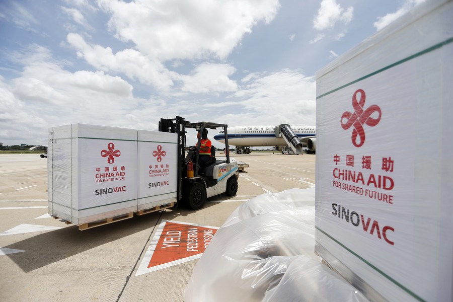 An airport worker transports packages of Sinovac COVID-19 vaccines at Phnom Penh International Airport in Phnom Penh, Cambodia, Oct. 14, 2021. (Photo by Phearum/Xinhua)