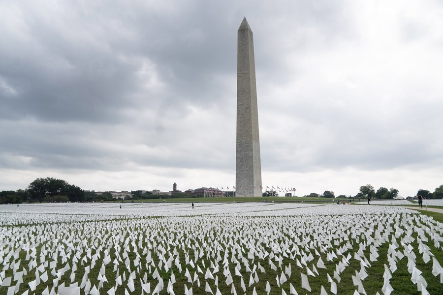 White flags to honor the lives lost to COVID-19 are seen on the National Mall in Washington, D.C., the United States, on Sept. 16, 2021. (Xinhua/Liu Jie)
