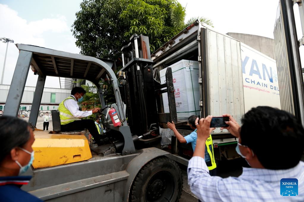 A staff member transfers China-donated COVID-19 vaccines at Yangon International Airport in Yangon, Myanmar, Dec. 22, 2021. A new batch of Sinovac COVID-19 vaccines donated by China arrived in Myanmar's Yangon on Wednesday. (Xinhua/U Aung)