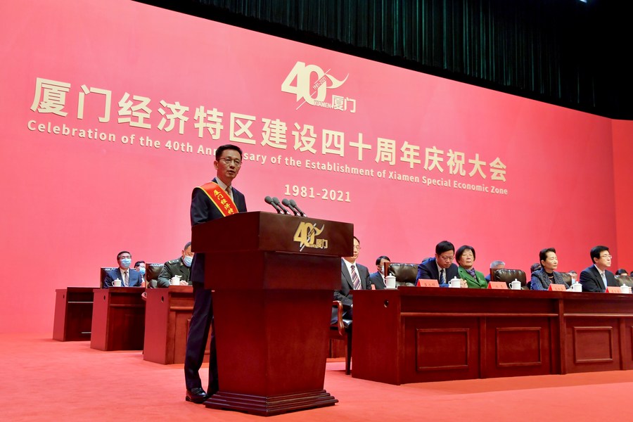 A representative speaks at a gathering marking the 40th anniversary of the establishment of the Xiamen Special Economic Zone in Xiamen, southeast China's Fujian Province, Dec. 21, 2021. (Xinhua/Jiang Kehong)