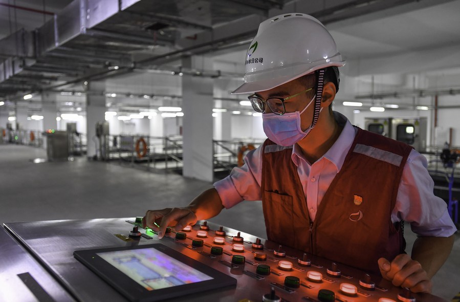 A technician works at Guangzhou Shijing sewage plant in Guangzhou, south China's Guangdong Province, Nov. 19, 2021. (Xinhua/Liu Dawei)