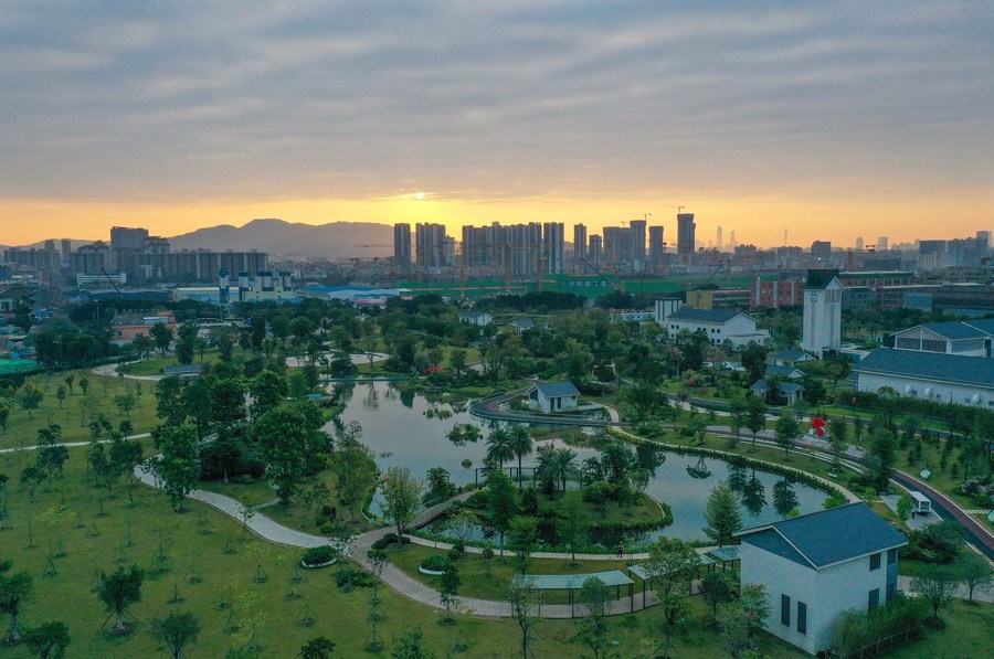 Aerial photo taken on Nov. 19, 2021 shows a view of the Guangzhou Shijing sewage plant in Guangzhou, south China's Guangdong Province. (Xinhua/Liu Dawei)