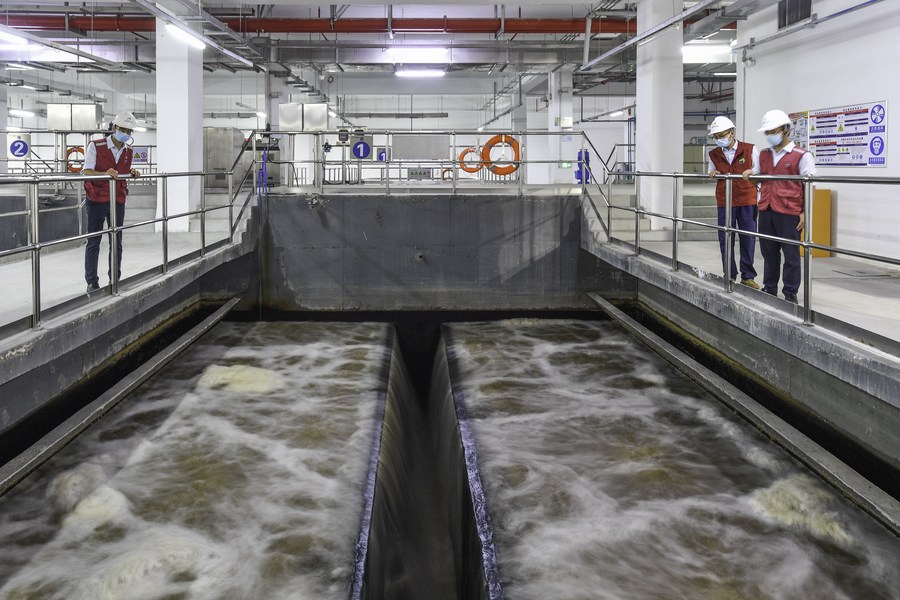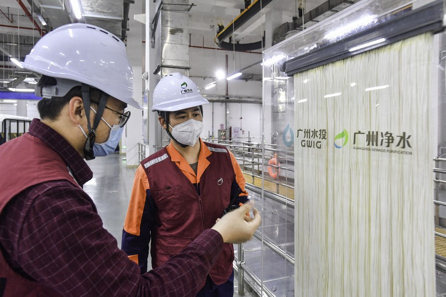 Technicians work at Guangzhou Shijing sewage plant in Guangzhou, south China's Guangdong Province, Nov. 19, 2021. (Xinhua/Liu Dawei)