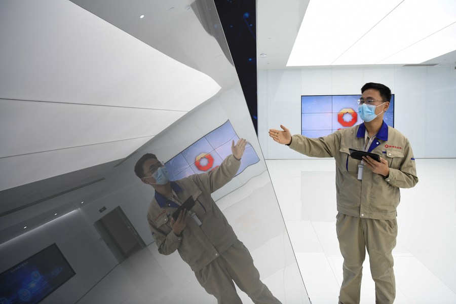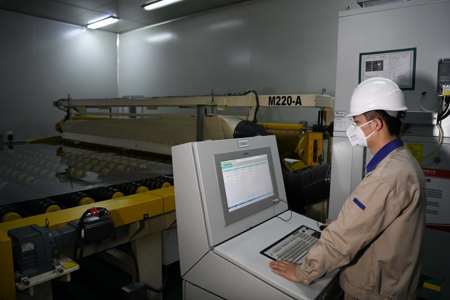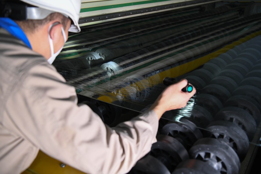 A worker checks a glass production line at a company in Bengbu, east China's Anhui Province, Dec. 21, 2021. (Xinhua/Zhang Duan)