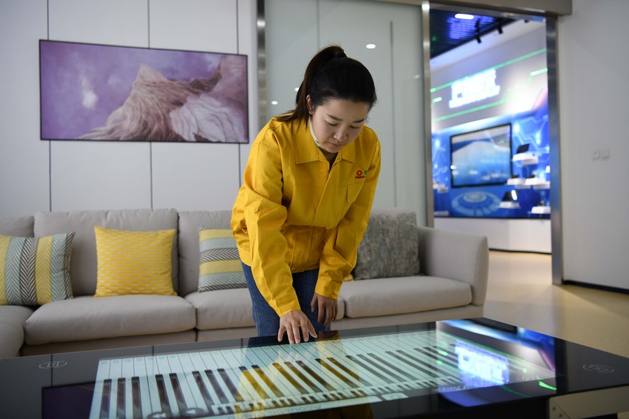 A staff member displays a glass tea table with entertainment function in Bengbu, east China's Anhui Province, Dec. 22, 2021. (Xinhua/Zhang Duan)■