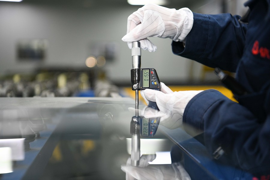 A worker measures the thickness of an ultra-thin display glass product at a company in Bengbu, east China's Anhui Province, Dec. 21, 2021. (Xinhua/Zhang Duan)