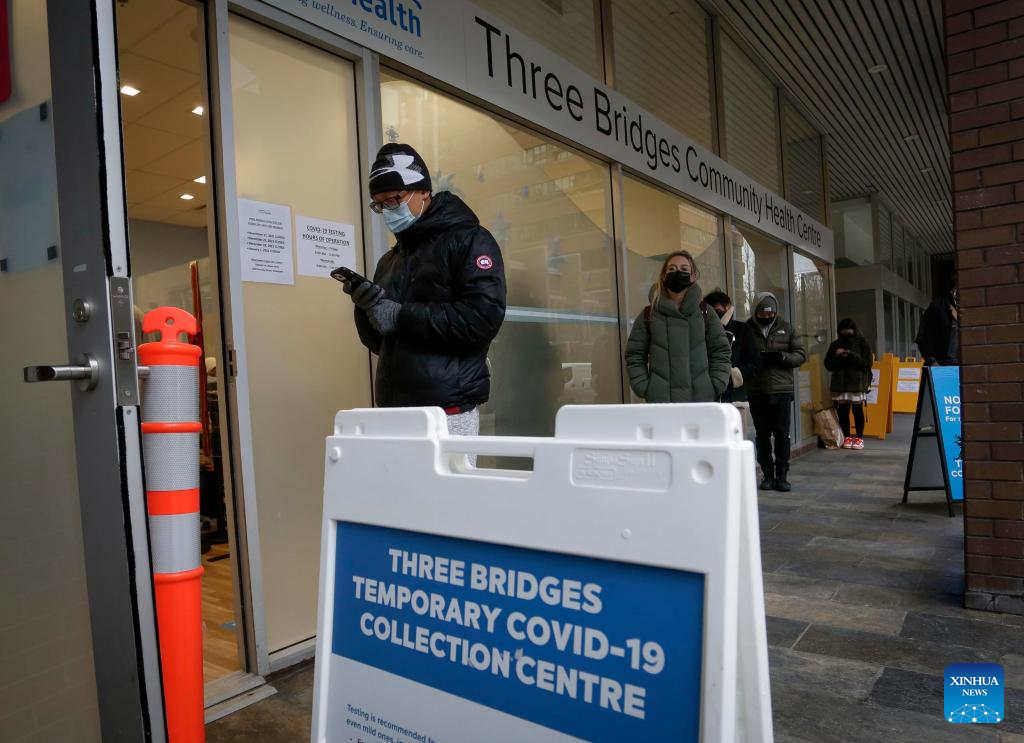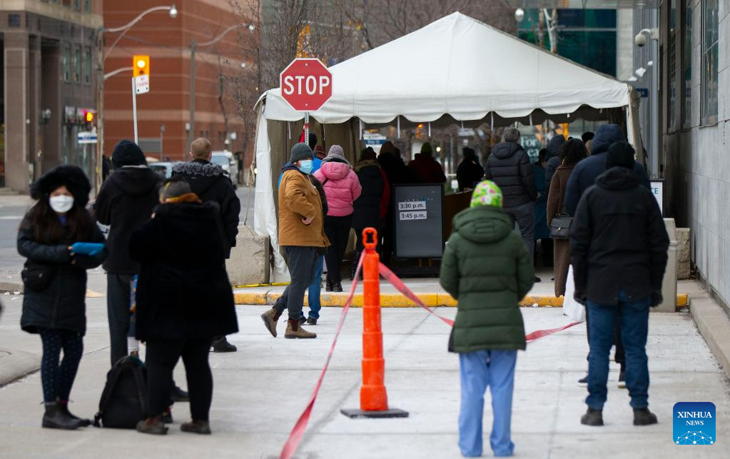 People wearing face masks line up to enter a COVID-19 assessment center in Toronto, Canada, on Dec. 23, 2021. Canada set a new daily record of 20,699 COVID-19 cases on Thursday, bringing the cumulative total number to 1,945,754 cases with 30,131 deaths, according to CTV. (Photo by Zou Zheng/Xinhua)