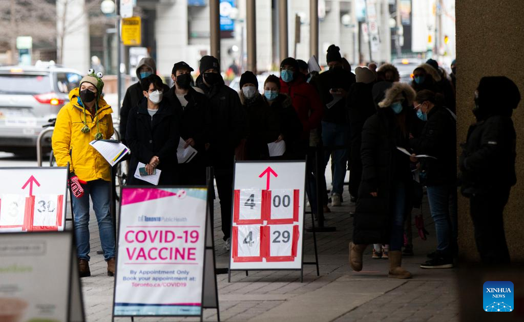 People line up to enter a COVID-19 vaccination clinic in Toronto, Canada, on Dec. 23, 2021. Canada set a new daily record of 20,699 COVID-19 cases on Thursday, bringing the cumulative total number to 1,945,754 cases with 30,131 deaths, according to CTV. (Photo by Zou Zheng/Xinhua)