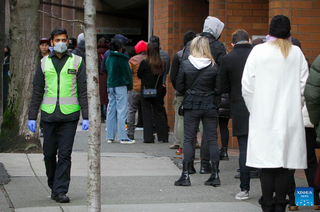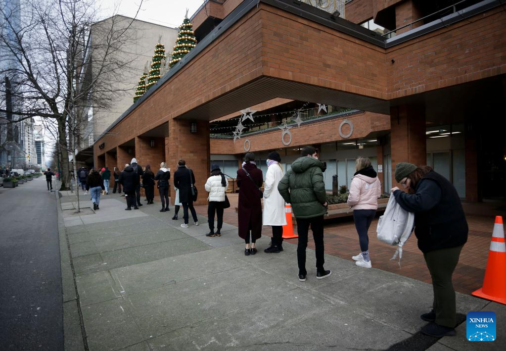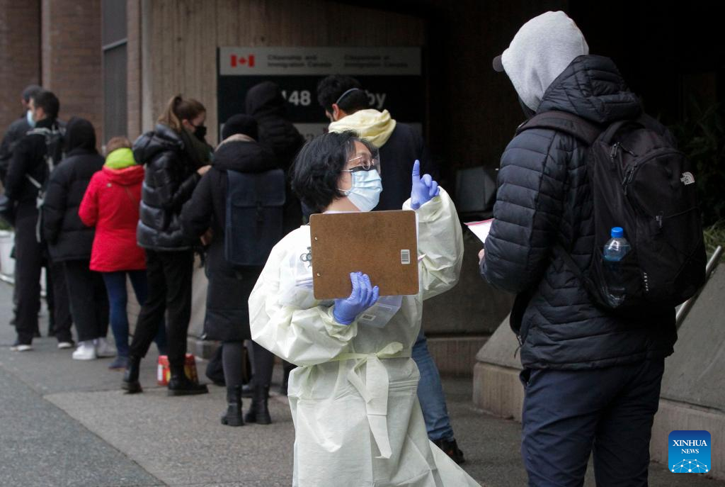 People line up for COVID-19 tests at a temporary testing site in Vancouver, Canada, Dec. 23, 2021. Canada set a new daily record of 20,699 COVID-19 cases on Thursday, bringing the cumulative total number to 1,945,754 cases with 30,131 deaths, according to CTV. (Photo by Liang Sen/Xinhua)