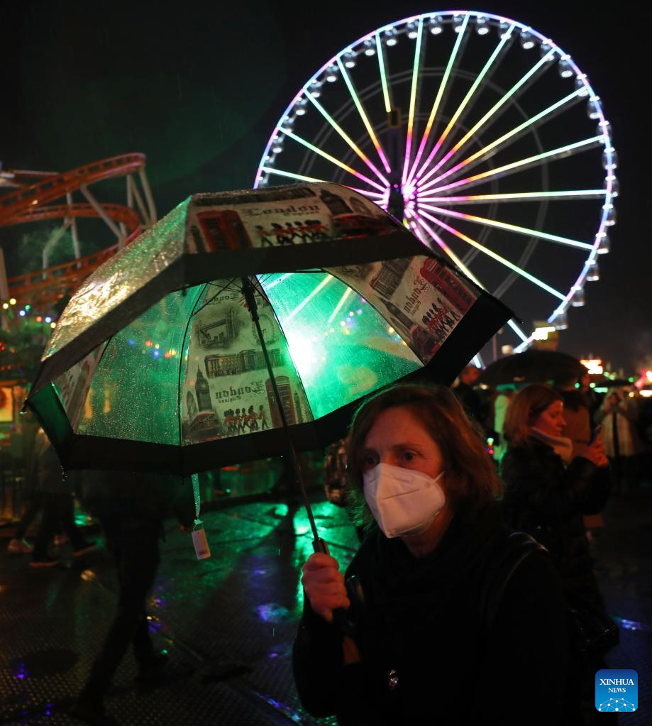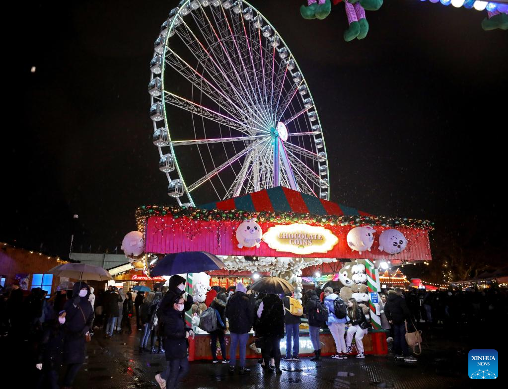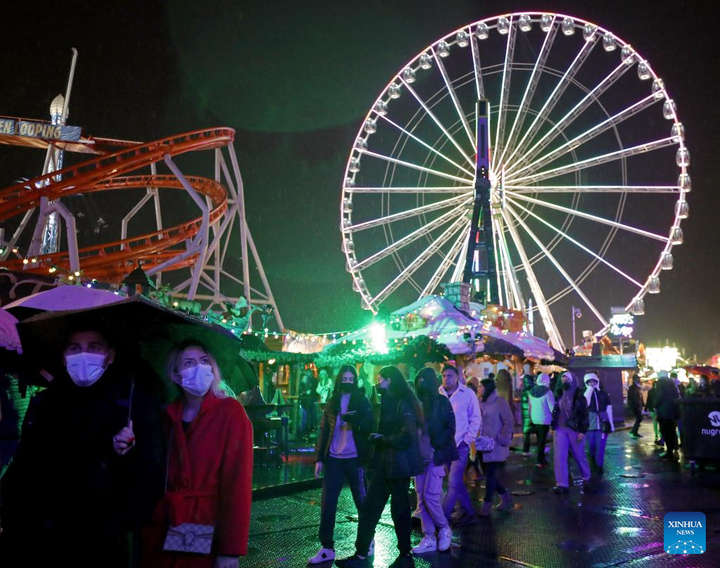 People wearing face masks visit Hyde Park Winter Wonderland on Christmas Eve in London, Britain, Dec. 24, 2021. Britain has reported another 122,186 coronavirus cases in the latest 24-hour period, exceeding 120,000 daily cases for the first time since of the start of the pandemic, according to official figures released Friday. (Xinhua/Li Ying)