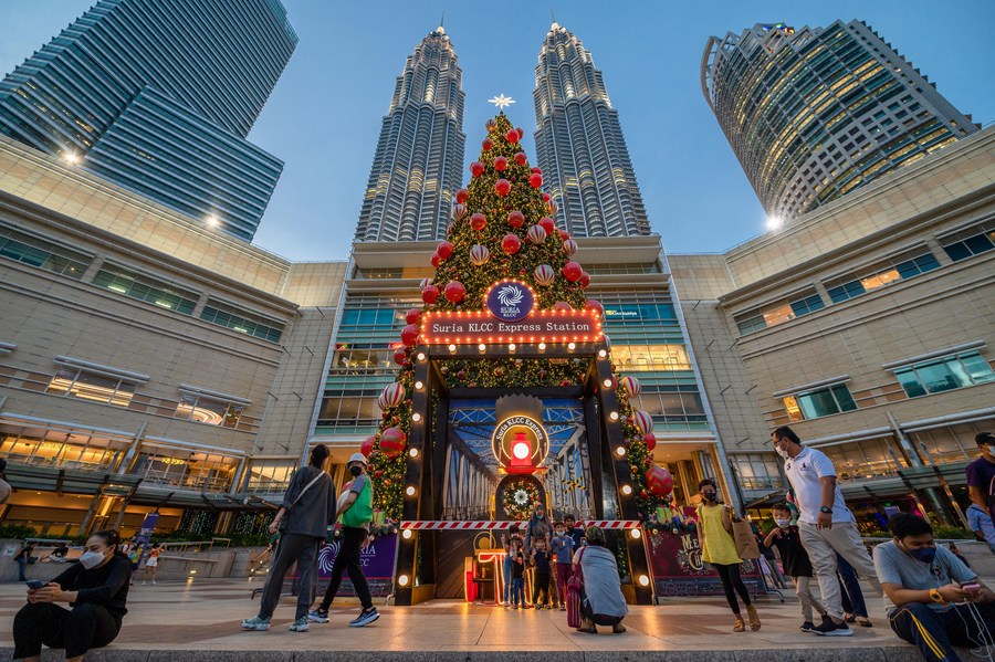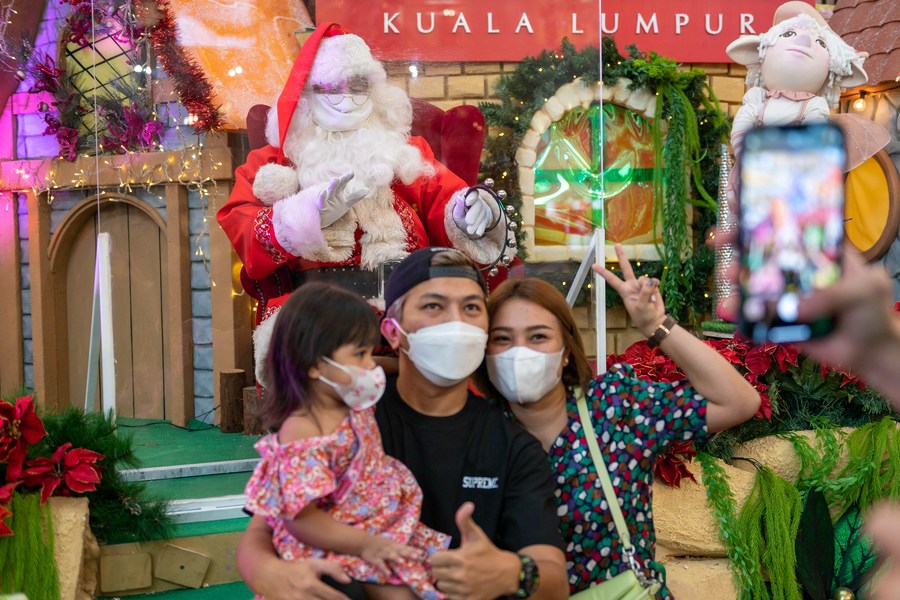 People pose for photos in front of Christmas decorations at a shopping mall in Kuala Lumpur, Malaysia, Dec. 23, 2021. (Photo by Chong Voon Chung/Xinhua)