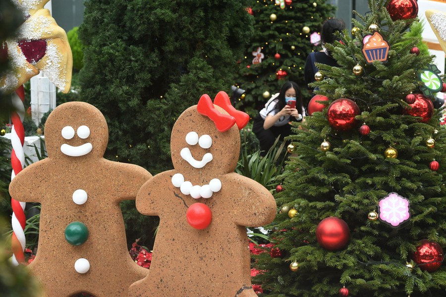 People view Christmas decorations at the Flower Dome of Singapore's Gardens by the Bay on Dec. 13, 2021. (Xinhua/Then Chih Wey)
