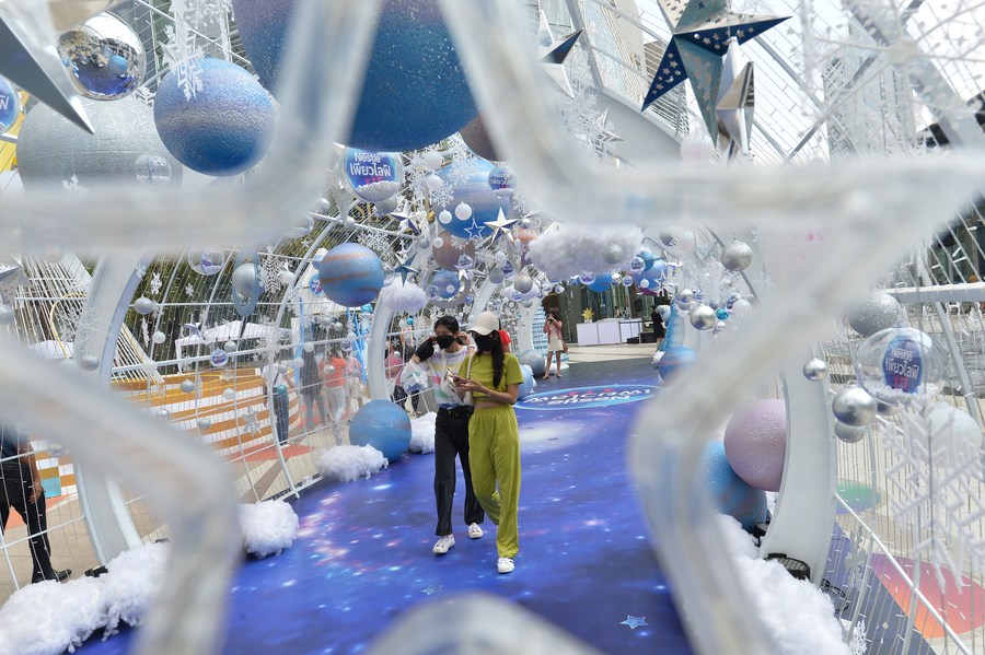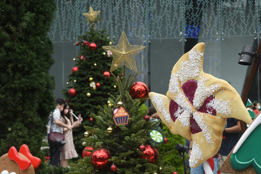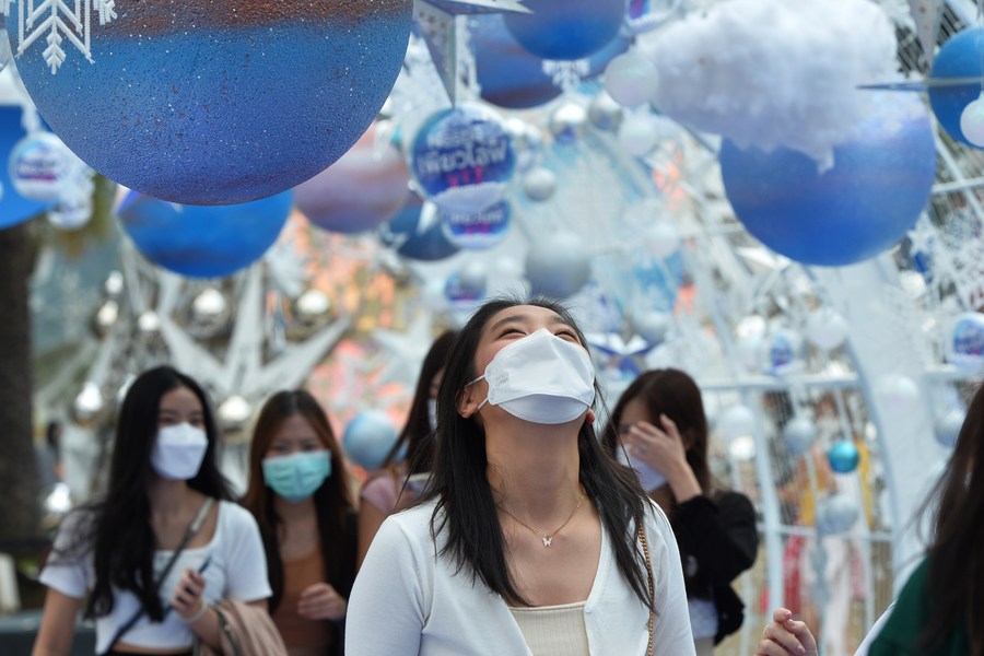 People walk past Christmas decorations at a shopping mall in Bangkok, Thailand, on Dec. 24, 2021. (Xinhua/Rachen Sageamsak)
