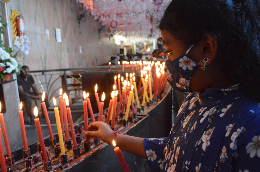 A woman lights candles during Christmas Eve mass prayers at St. Mary's Basilica Church in Bangalore, India, Dec. 24, 2021. (Str/Xinhua)