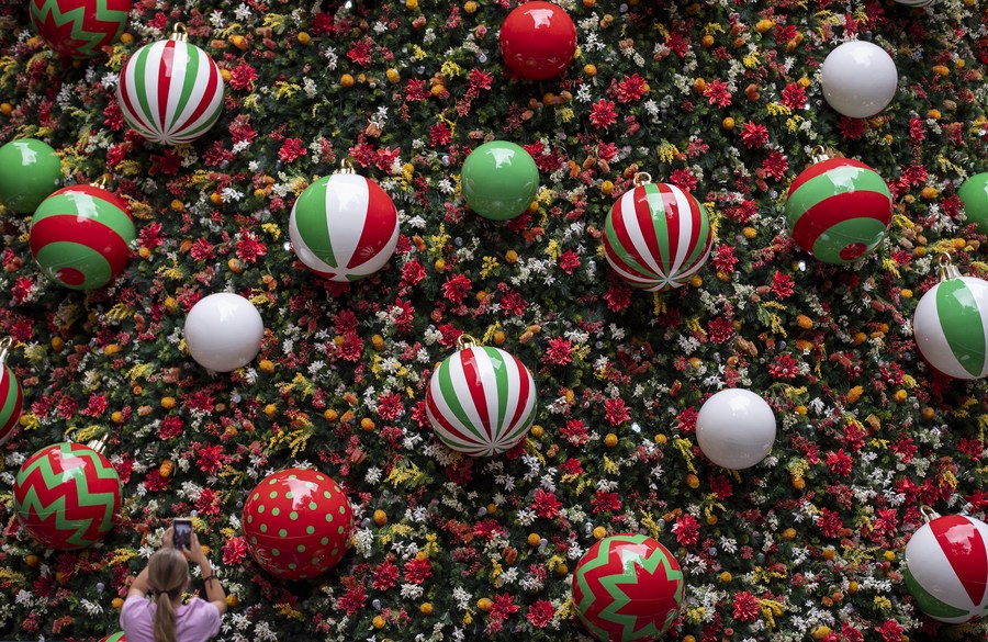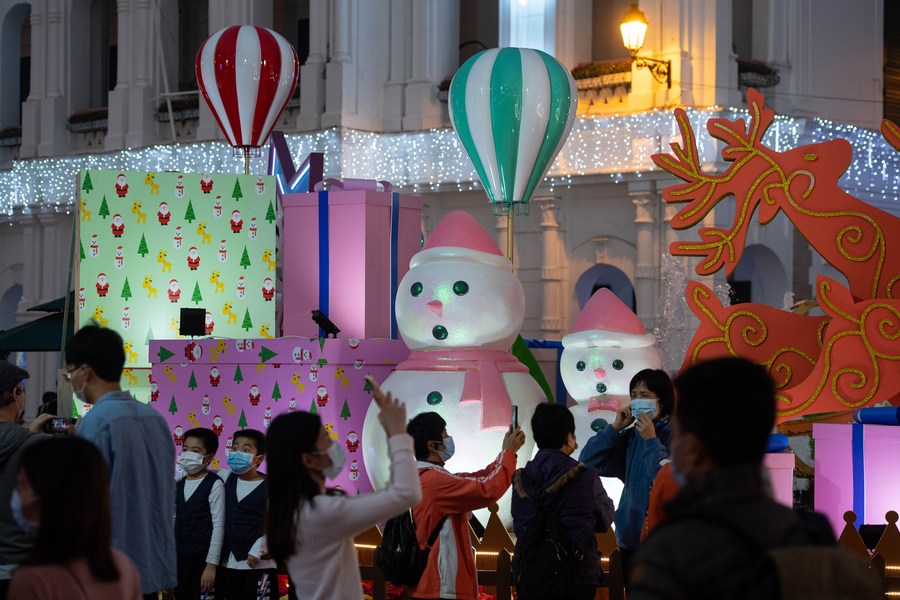 People take photos of Christmas decorations at the Senado Square in south China's Macao, on Dec. 24, 2021. (Xinhua/Cheong Kam Ka)