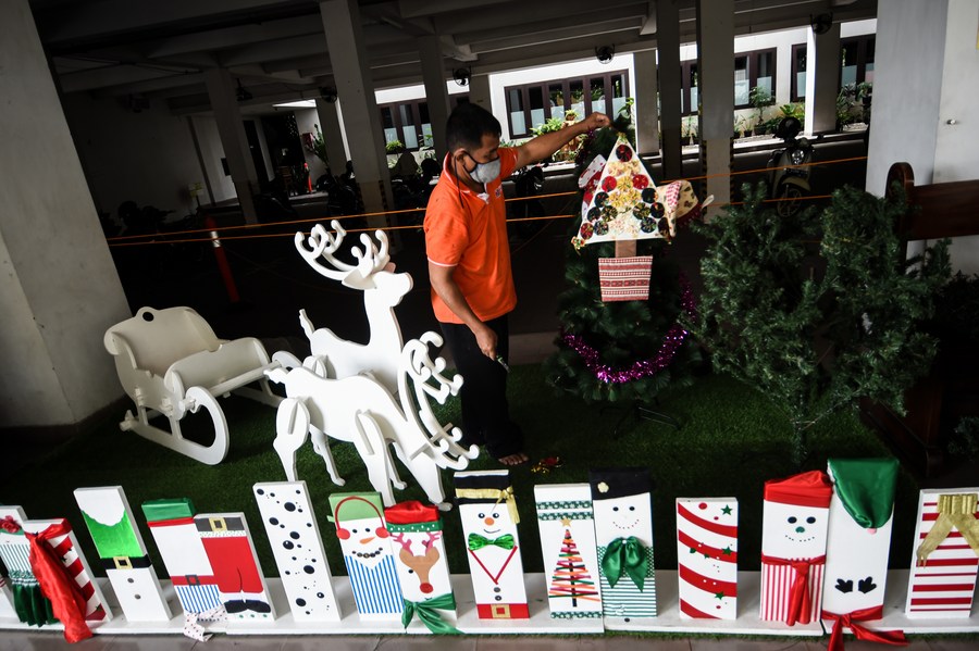 A worker sets up a Christmas tree at Catholic Church Saint Barnabas in South Tangerang, Banten Province, Indonesia, Dec. 23, 2021. (Xinhua/Agung Kuncahya B.)