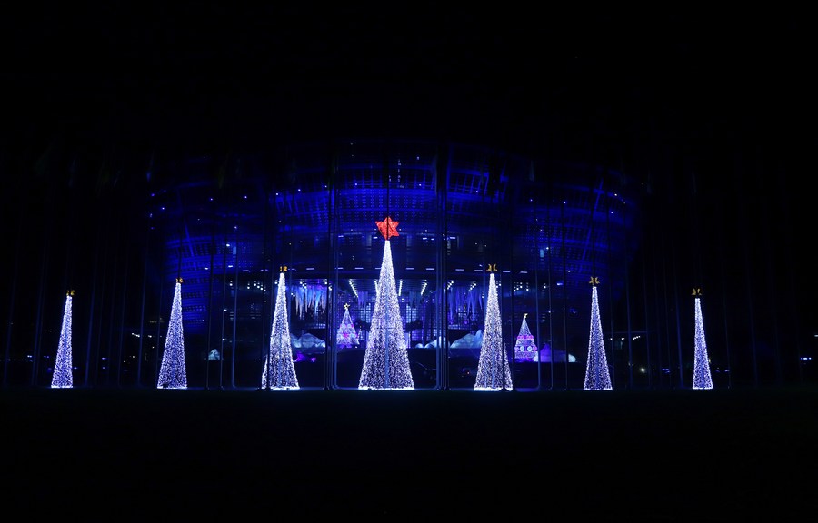 A building is decorated with lights and Christmas decorations in Colombo, Sri Lanka, Dec. 23, 2021. (Photo by Ajith Perera/Xinhua)