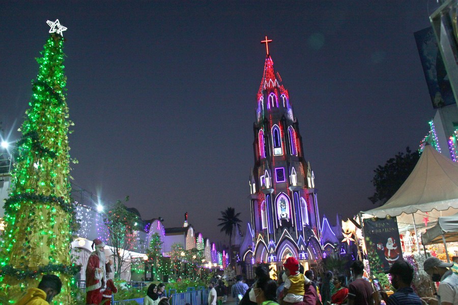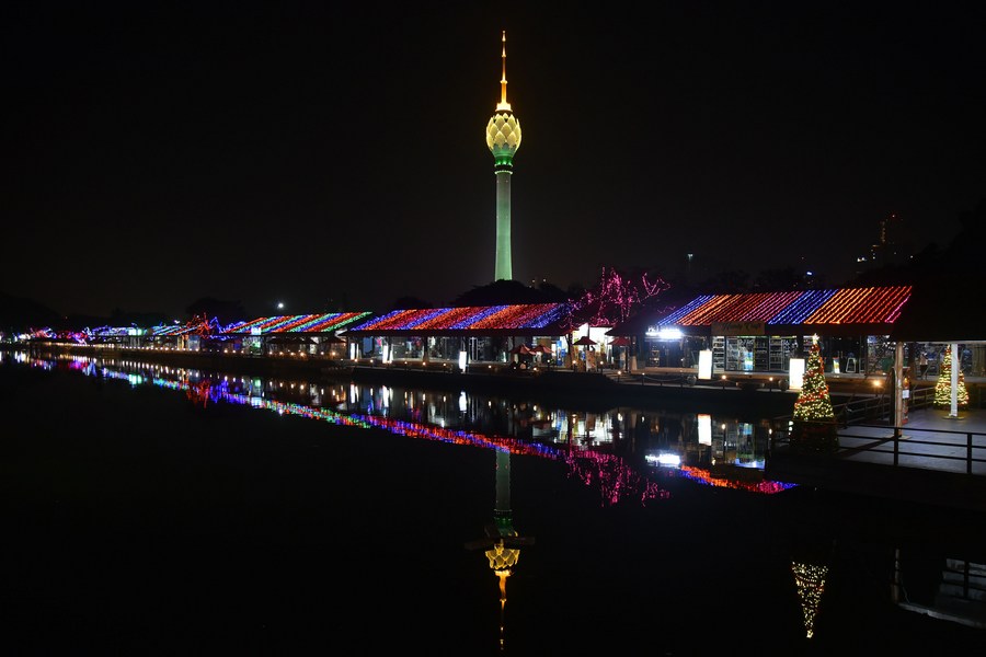 A market is decorated with lights and Christmas decorations in Colombo, Sri Lanka, Dec. 23, 2021. (Photo by Gayan Sameera/Xinhua)