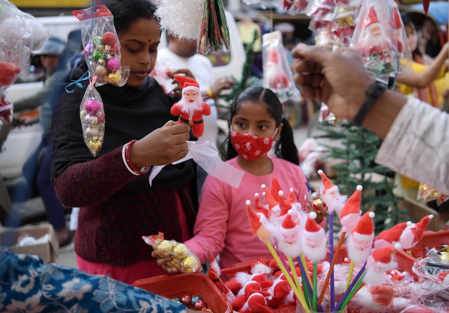 People shop for Christmas decorations at a market in Agartala, the capital city of India's northeastern state of Tripura, Dec. 24, 2021. (Str/Xinhua)