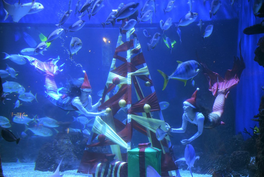Divers in mermaid costumes decorate an underwater Christmas tree at Jakarta Aquarium & Safari in Jakarta, Indonesia, Dec. 20, 2021. (Xinhua/Zulkarnain)